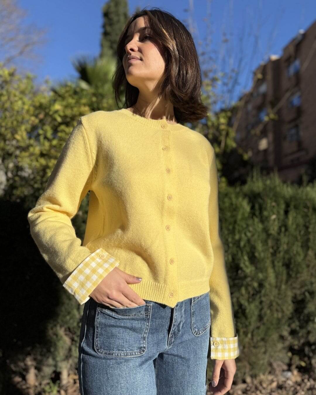 Añade un toque de frescura y color a tu armario con esta chaqueta básica y versátil. Su diseño con puños a cuadros aporta un detalle original que destaca en cualquier look.