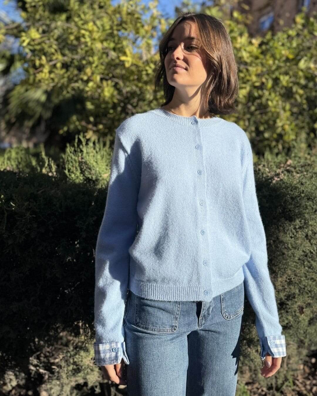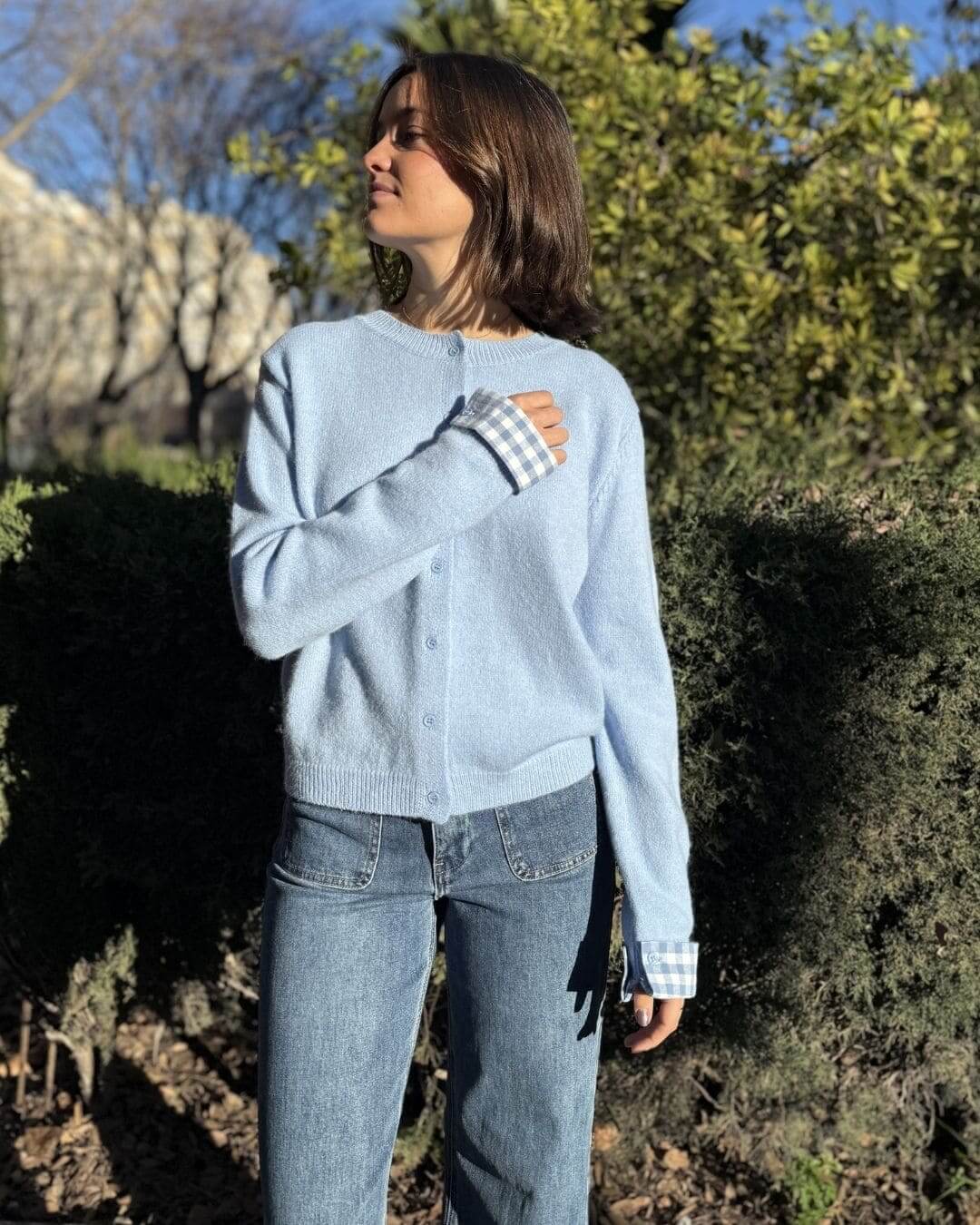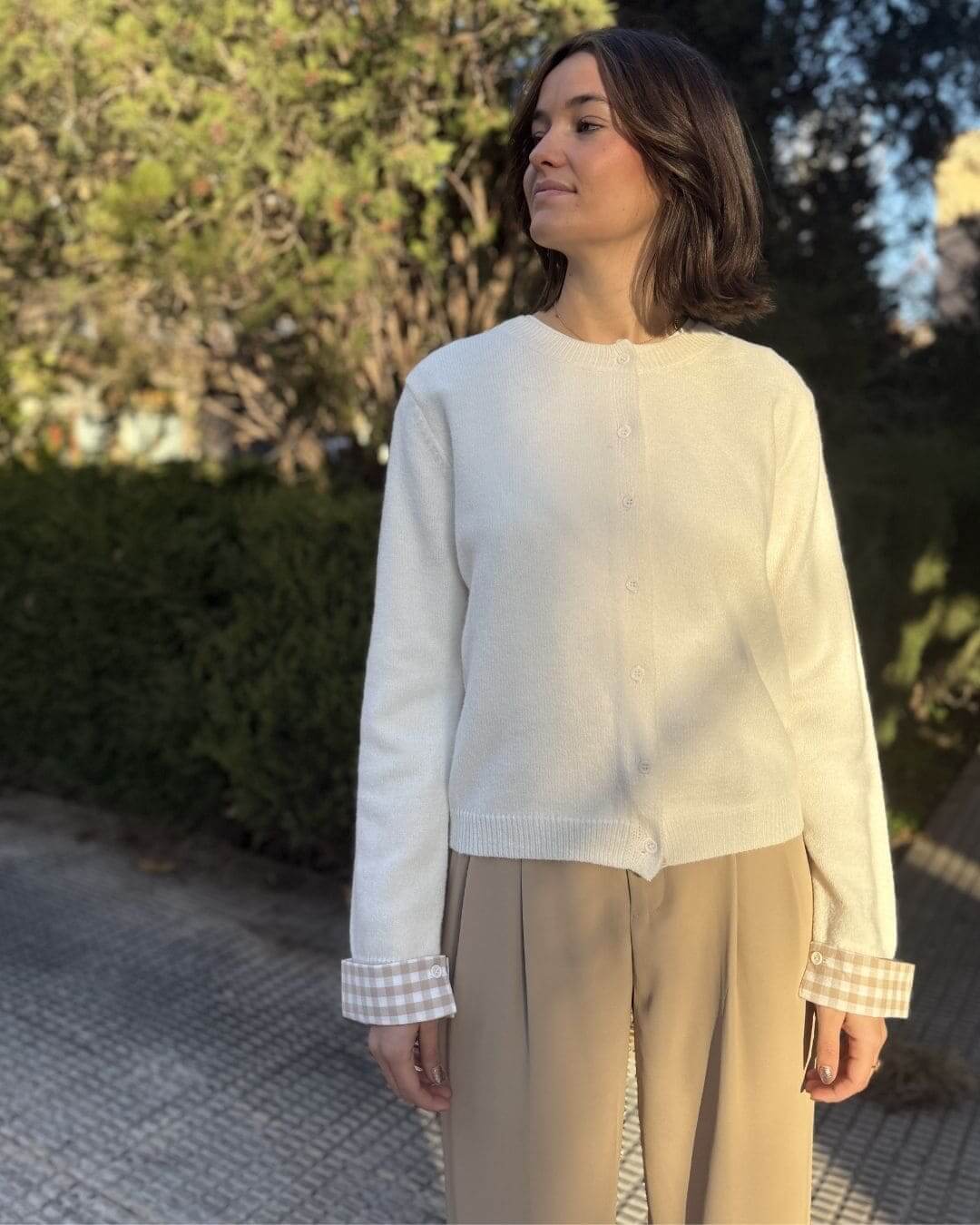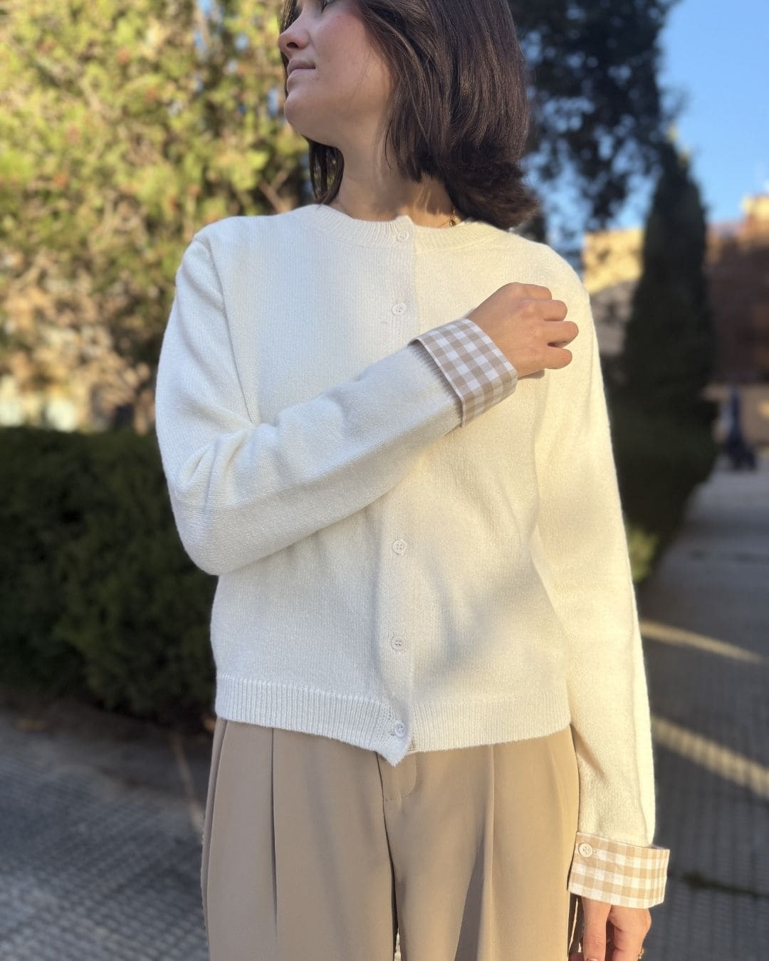 • Diseño único: Corte clásico con botones frontales y un sutil contraste en los puños a cuadros, perfecto para un estilo casual-chic.