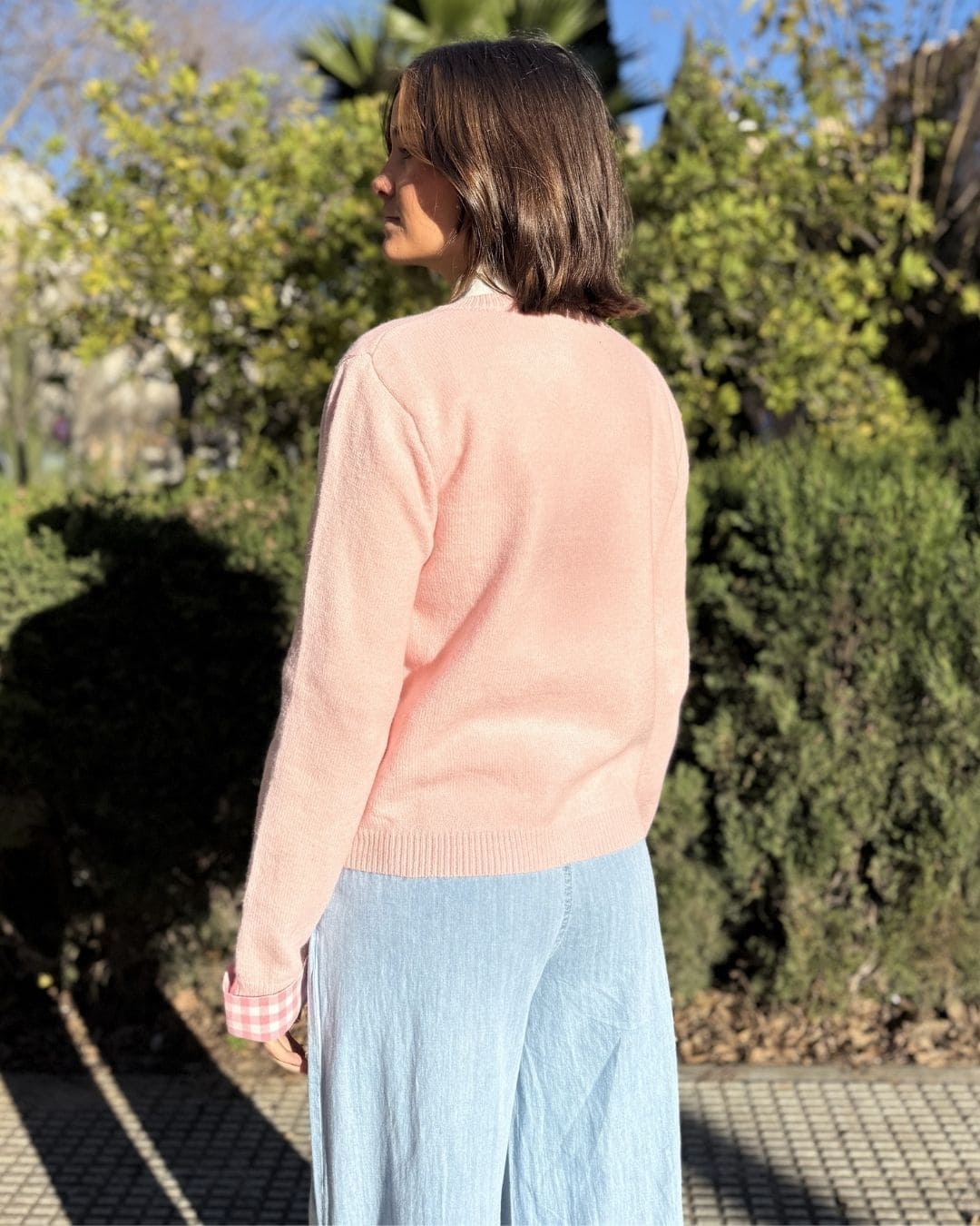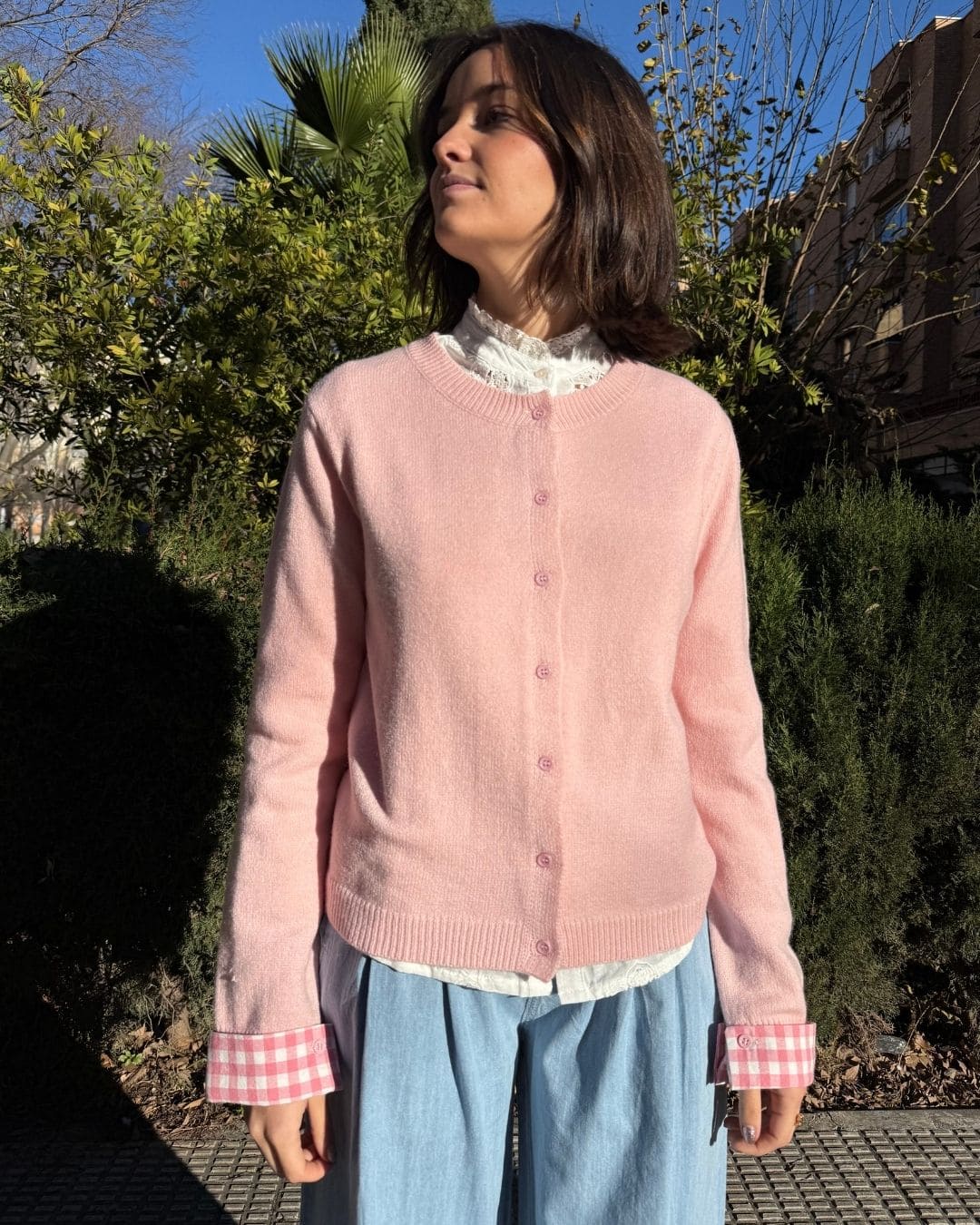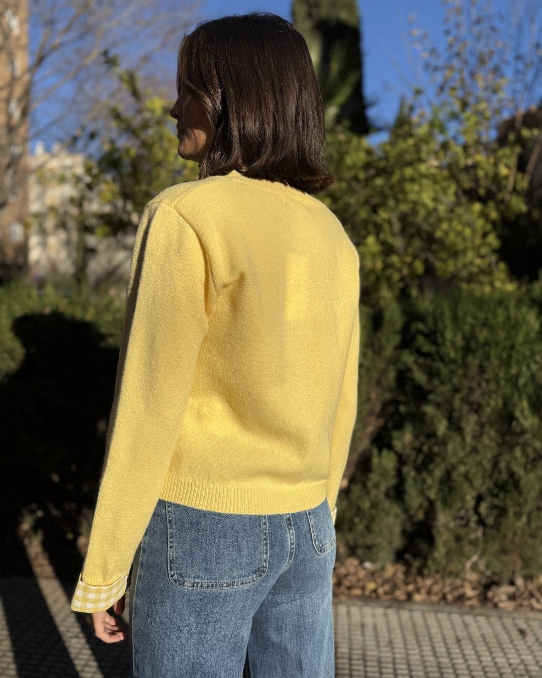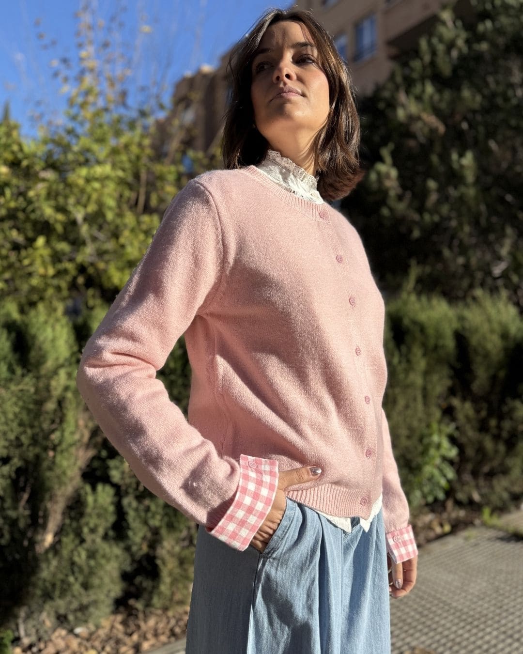 • Diseño único: Corte clásico con botones frontales y un sutil contraste en los puños a cuadros, perfecto para un estilo casual-chic.
