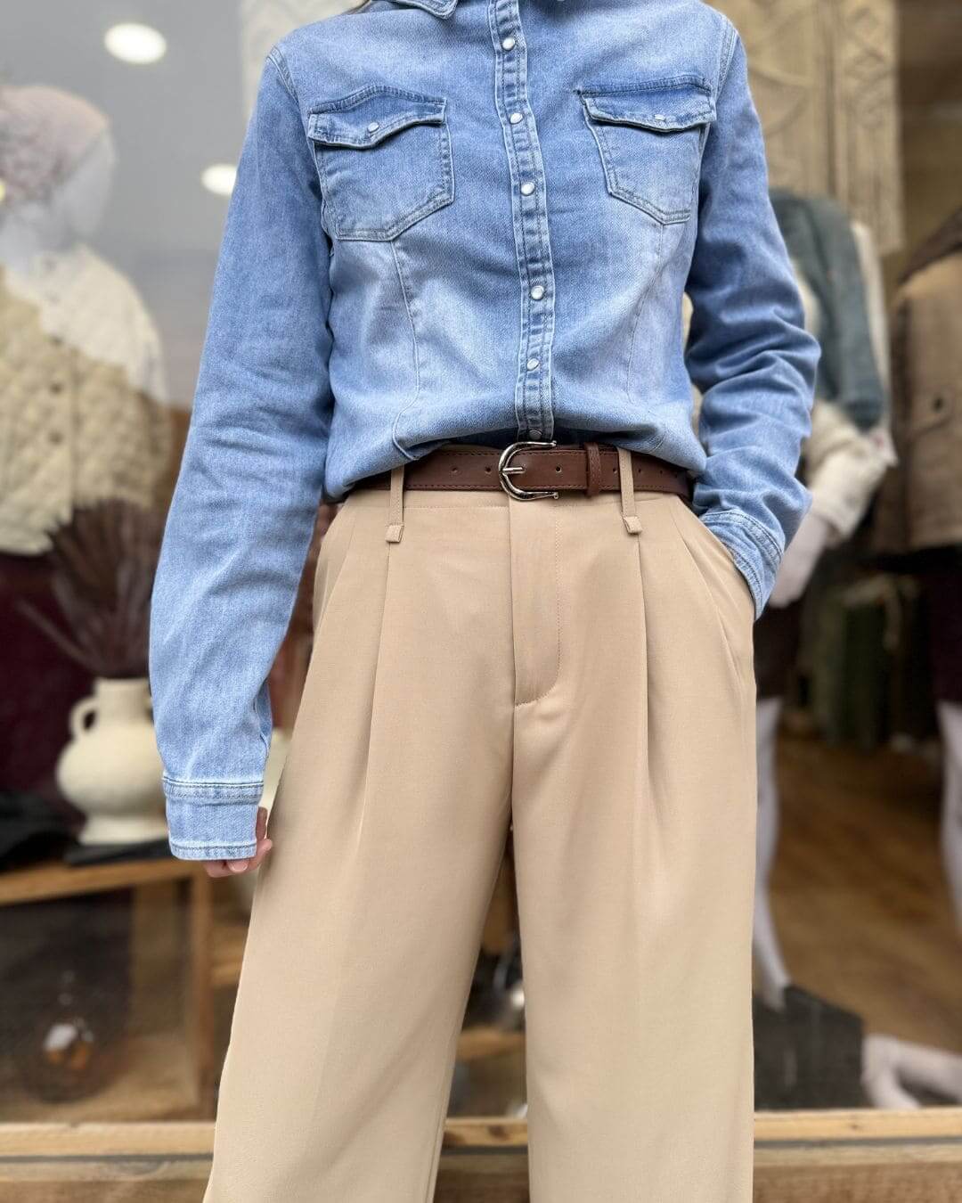 - Diseño cómodo: Corte amplio y pinzas frontales que estilizan la figura, aportando un toque clásico y contemporáneo.